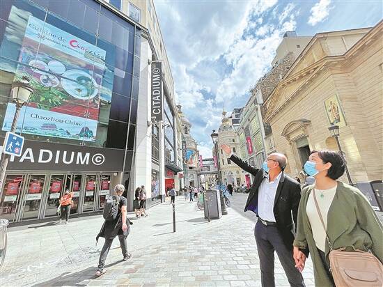 游客在巴黎街头观看潮州美食宣传片