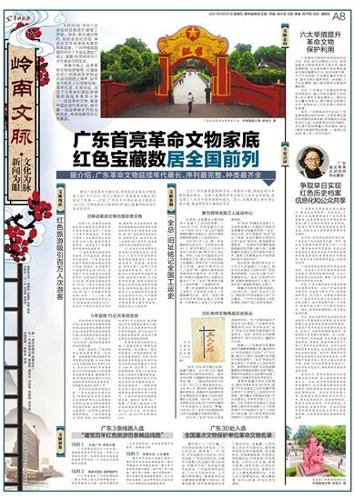 “广东是革命文物延续年代最长、序列最完整、种类最齐全的省份。”广东省文化和旅游厅革命文物处相关负责人介绍,经核定,全省现有不可移动革命文物1513处,其中除了30处全国重点文物保护单位,还有省级文物保护单位105处,市县级文物保护单位729处,一般不可移动文物649处;全省可移动革命文物4544件(套),全部都是珍贵文物(分为一、二、三级);拥有全国红色旅游经典景区13个、红色旅游A级景区23个。全省21个市82个县列入中宣部、财政部、文化和旅游部、国家文物局联合公布的革命文物保护利用片区(有重复划入的县、市、区),包括原中央苏区片区、海陆丰片区、长征片区(红一方面军)和广东片区,是全国为数不多全域覆盖的省份。