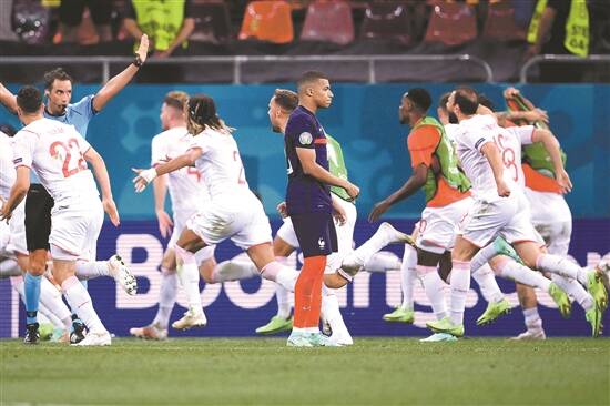 罚丢点球后落寞的姆巴佩(中)与身旁疯狂庆祝的瑞士球员 图/视觉中国