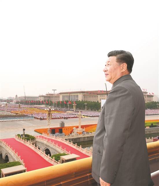 7月1日上午,庆祝中国共产党成立100周年大会在北京天安门广场隆重举行。这是习近平在天安门城楼上 新华社发