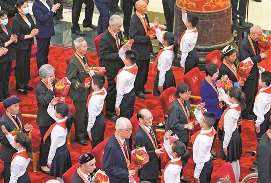 6月29日,庆祝中国共产党成立100周年“七一勋章”颁授仪式在北京人民大会堂金色大厅隆重举行。这是少先队员向勋章获得者献花,敬礼致意 新华社电