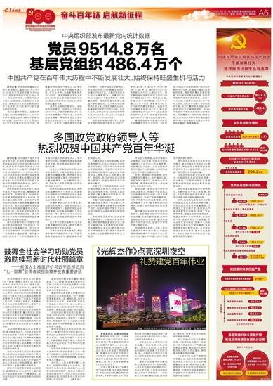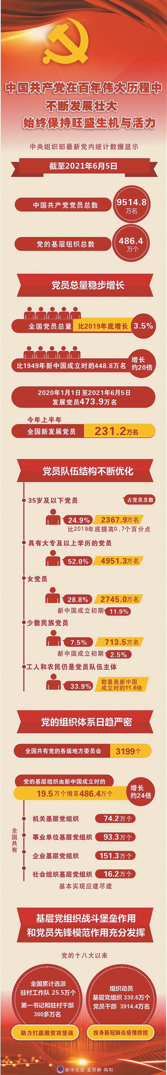 新华社电 中央组织部最新党内统计数据显示,截至2021年6月5日,中国共产党党员总数为9514.8万名,党的基层组织总数为486.4万个。历经百年风雨,中国共产党从小到大、由弱到强,从建党时50多名党员,发展成为今天已经拥有9500多万名党员、在14亿多人口的大国长期执政的党。