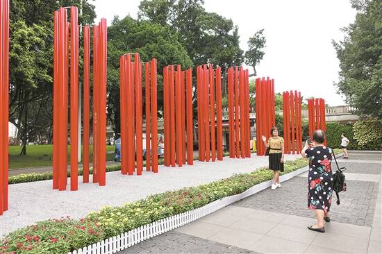“百岁峥嵘,中流砥柱;百年旗帜,心中飘扬。”记者在现场看到,《中流砥柱》使用柱阵设计,由10组红色铁柱组成。从远处看去,柱阵的外轮廓串联成一面生动飘扬的红旗。走近细看,每组10根的红色铁柱组成一个展览空间,把百年奋斗历程中的重要节点刻画在铁柱之上,化身让市民能够详细阅读的书卷。
