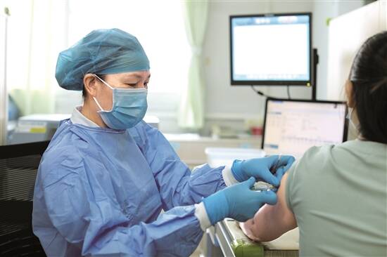在新冠疫苗接种点,防保科护长谭翠醒为市民接种疫苗