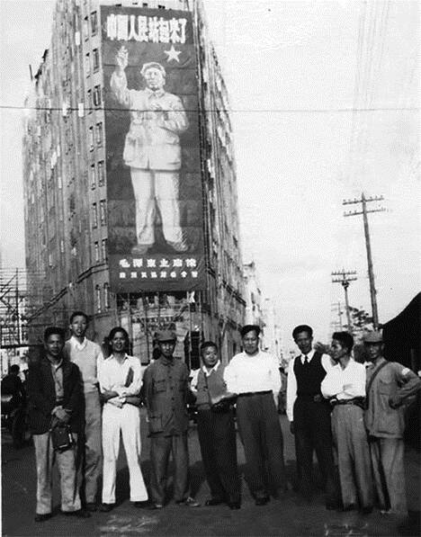 1949年,人间画会同仁在爱群大厦毛泽东巨像前留影 深圳关山月美术馆供图