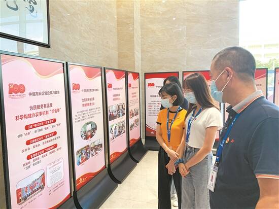 聚飞光电位于惠州仲恺高新区,于2019年成立公司党支部,现有18名党员,走进该公司,可以感受到党史学习教育浓厚的氛围,公司主楼内右边为仲恺高新区党史学习教育巡展展览,左边为聚飞光电为员工办实事的清单。
