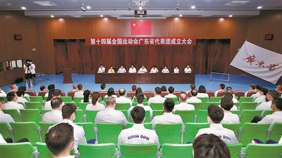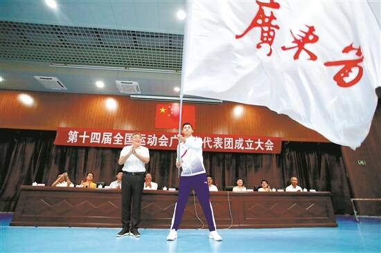 羊城晚报讯 记者苏荇报道:第十四届全国运动会广东省代表团成立大会昨天在黄村体育训练中心召开。广东省代表团团长、广东省副省长许瑞生向运动员代表李中洲授旗。广东省代表团常务副团长、广东省体育局局长王禹平表示,广东代表团的目标是成绩位居全国前列,同时争取运动成绩和精神文明双丰收。