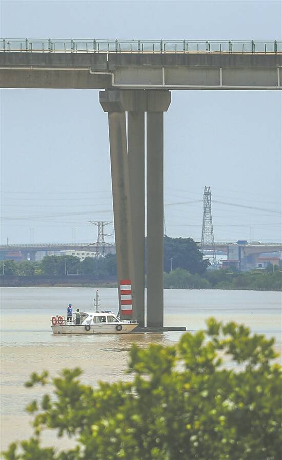 桥墩出现位移,有公务船在桥墩旁巡查 羊城晚报记者 梁怿韬 摄