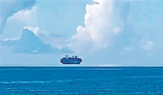在深圳,有网友拍到轮船在海上航行时,船底悬浮于空中与海面有空间间隔的“热到飞起”视觉场面,有网友认为这是海市蜃楼景观;广东省气象台相关业务人员解释,此场景并非“无中生有”的海市蜃楼景观,而是特定视角下,海岸边水汽因天气炎热而上升所产生的视觉错觉。