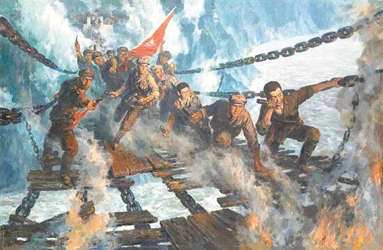 “1935年5月,北上抗日的红军向天险大渡河挺进。大渡河水流湍急,两岸都是高山峻岭,只有一座铁索桥可以通过。这座铁索桥,就是红军北上必须夺取的泸定桥。”这是《语文》(上海教育出版社)课本中《飞夺泸定桥》开篇的句子。而这篇课文的插图《飞夺泸定桥》,正是由广东画家雷坦创作于1977年,现藏于广州艺术博物院。