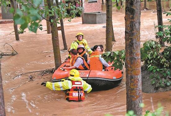 20日,河南登封突发山洪,消防救援人员在转移被困村民 新华社发