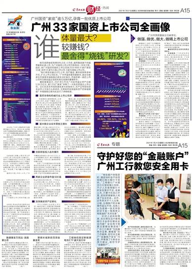 据了解,在创新研发方面,广州在地方国资中首创“政策+联盟+基金”的创新模式,企业研发投入翻番至2020年达159.5亿元,年均增速逾16%,研发强度上升至3.22%;2020年高新技术产品产值占工业总产值的69%,比2015年提高23.4个百分点。截至2020年底,国资系统拥有科技人员逾4.1万人,12个院士工作站聘请中外院士40名。