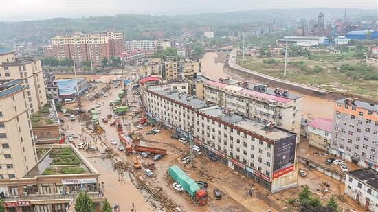 米河镇位于豫西山区,全镇共有19个行政村,常住人口约3万余人,其中镇区周边有约2万人。7月20日,位于两条河流交汇处的米河镇镇区被漫过河堤的洪水淹没,大量道路损毁,房屋进水,车辆被淹。经过米河镇的310国道被水冲泡损毁100余米,同时有大量的树干、车辆堵塞道路。