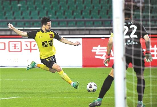 7月21日,广州队球员洛国富(左)在比赛中射门 新华社发