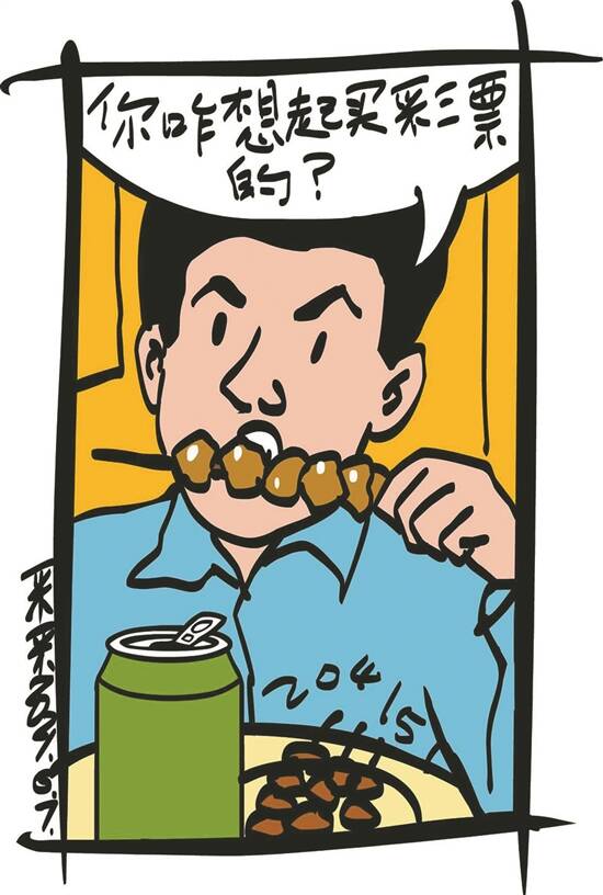 两人在一烧烤摊找了位置坐下,要了烤肉、烤鱼和一大罐生啤,之后边吃边聊起来。王文问:“你咋想起买彩票的?”刘强说:“和我送快递的同事都在玩彩票,我也跟着想试试运气,没想到运气不错,昨天中了3000元。”王文伸着拇指说:“你运气真的不错。”