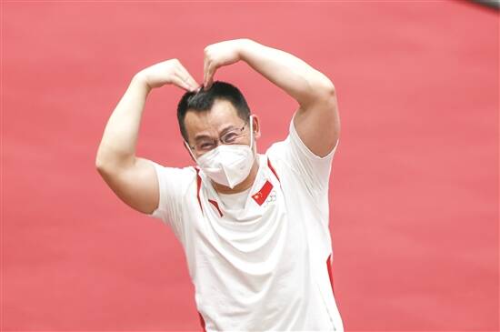 中国女子举重队主教练张国政现场摆造型 新华社发