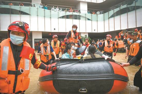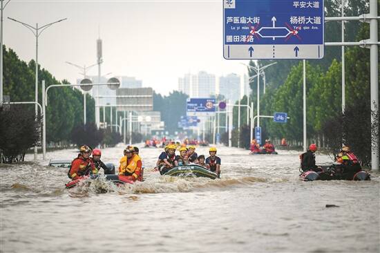 救援队伍带着皮筏艇转运医院被困人员 羊城晚报特派郑州记者 梁喻 摄
