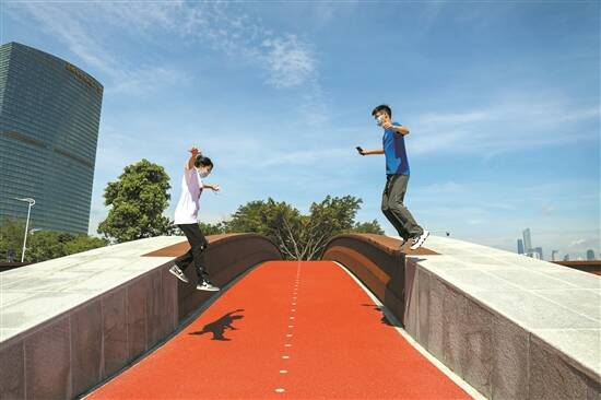 “碧道建设,是在原有阅江路江边空间上做加法,丰富各种功能。”广州市城市规划勘测设计研究院景观所主创设计师郑庆之介绍,阅江路江边绿地很早就建成。但除了广州塔和琶醍附近,绿地的其余区域很少有人特地前去游玩。在对绿地进行碧道改造时,设计团队先是增设儿童活动空间;并根据游客对快慢生活的不同需求考虑进行“五道合一”设计。通过上述改造,市民和游客可以在碧道陪孩子玩,可以快慢行走乃至骑行,游玩功能大大提升。