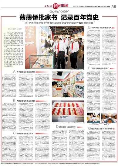 在党史学习教育的开展中,中共江门市委宣传部致力从自身地域实际出发,以侨批为载体、以五邑华侨华人为对象,组织协调五邑大学、民间藏家、各级媒体,以理论研究为基础,挖掘出一封封深烙红色印记的侨批,生动地讲述了百年党史中广大华侨华人与中国共产党的故事,受到广泛好评。