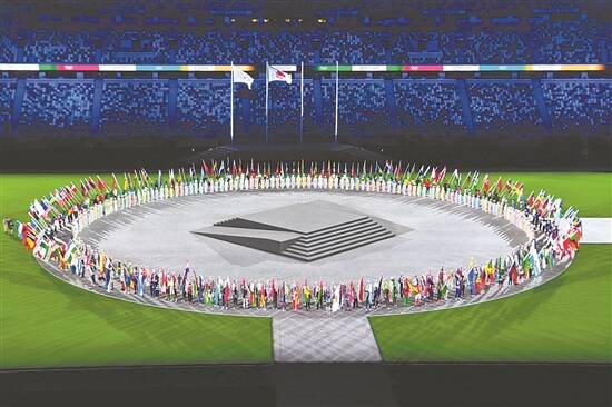 在灯光特效的帮助下,一个由光组成的奥运五环出现在新国立竞技场的上空。在这个特殊的时期,奥林匹克就代表着光的力量。运动员们在场地上载歌载舞,“更快、更高、更强、更团结”的奥运格言在此刻得到了更生动的表现。