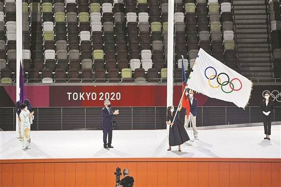 随着现场灯光熄灭,大屏幕上开始闪现着在东京奥运会上演的一幕幕精彩瞬间。一束束礼花腾空而起,照亮了东京的夜晚。随后,各国代表团旗手高举国旗步入场内,在奥运圣火的映照下围成了一个圈。作为东京奥运会的主角,他们的精彩表现闪耀了东京的夏天,正如国际奥委会主席巴赫所说:“运动员为奥运会注入了灵魂。”