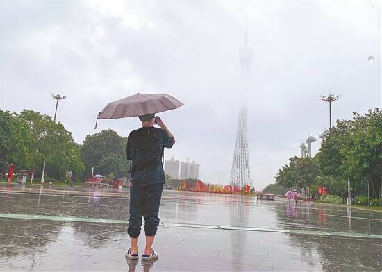 9日,游客冒雨打卡小蛮腰 羊城晚报记者 梁怿韬 摄
