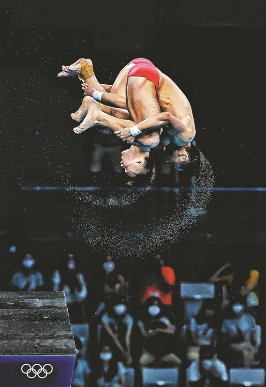 7月26日,东京奥运会跳水男子双人10米跳台决赛中,中国选手曹缘、陈艾森在比赛中翻腾