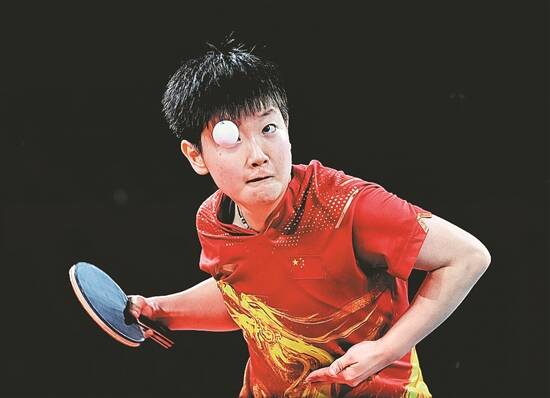 7月29日,女子乒乓球单打决赛中,孙颖莎在全神贯注地发球