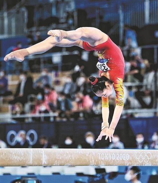 7月27日,体操女子团体决赛,中国健儿在平衡木上展现优美的身姿