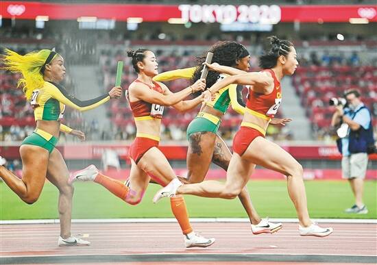 8月6日,东京奥运会女子4×100米接力决赛中,中国队员葛曼棋与梁小静交接棒中奋力直追