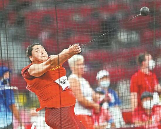 8月3日,东京奥运会女子链球决赛,中国选手王峥在比赛中奋力一搏