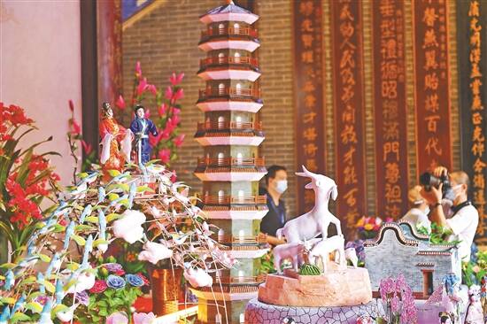 羊城晚报讯 记者丰西西、郭思琦,通讯员杨静报道:8月14日是农历七月初七,又到七夕佳节。在目前广州乞巧活动最集中、规模最大的村落——天河珠村,一年一度的七夕乞巧民俗活动正在举行。这是2021年广州乞巧文化节系列活动的“重头戏”。因为疫情防控缘故,今年的乞巧文化节和往年“不一样”,虽然“拜七娘”等传统仪式如期举行,却并未对外开放,而是采用线上直播的方式,让人们足不出户就能感受到乞巧文化作为国家级非遗的魅力。