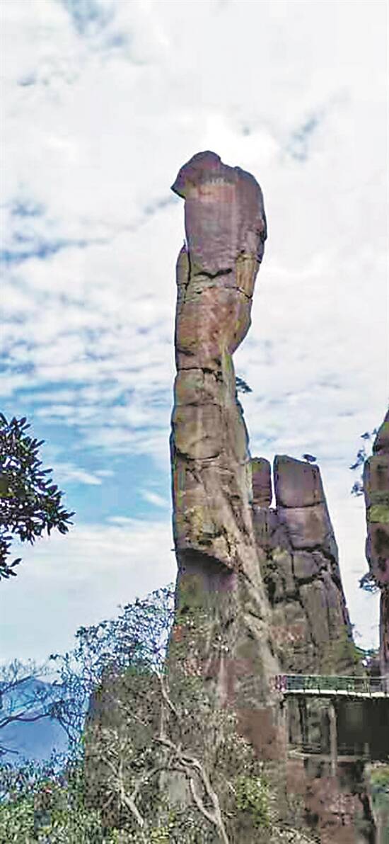 有趣的是,走过“司春女神”继续往高处,来到“企鹅献瑞”景点,却见一排数十米高的石岩,就像数十只毕恭毕敬的企鹅,正在向“司春女神”拱身作揖,虔诚可见;而从“企鹅献瑞”下坡往东,对面的峰林中更有一座百多米高的峰柱像极了伸长脖子、伺机出动的巨蟒,这就是著名的“巨蟒出山”,据说它正扑向这群峰之中的某处稀世珍宝,却被女神施法定住……一个个神奇的传说伴着我们前行的步伐,让人只顾对着这些奇峰异石称奇叫绝,忘了疲乏。