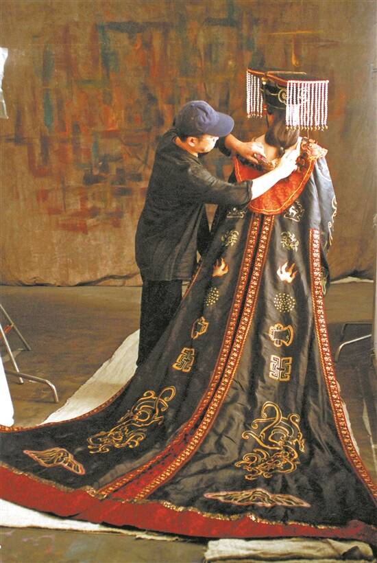 叶锦添在电视剧《大明宫词》拍摄过程中帮助演员调整服装 (资料照片)
