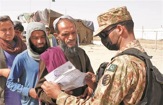 8月27日,在巴基斯坦与阿富汗的边境口岸杰曼,巴基斯坦士兵查看回国的阿富汗人的证件 新华社发