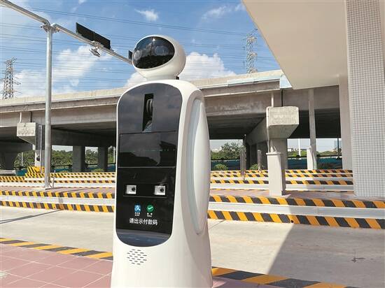 在近日开通的新化快速路B匝道长洲岛收费站入口,一个憨态可掬的智能机器人站在站台上。记者了解到,广州交投集团率先在新化快速路长洲岛收费站和机场高速收费站使用智能机器人收费,车辆进入收费车道识别车牌后,智能机器人会发出语音提示“请出示付款码”,车主在扫码区域扫描手机付款码即可直接预缴通行费。