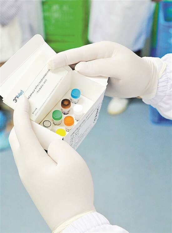 工作人员展示即将组装完成的联检试剂盒 新华社发