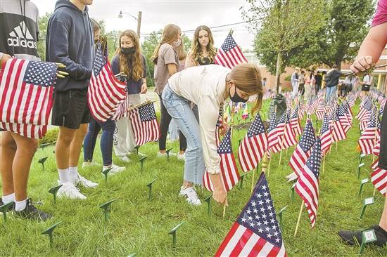 当地时间2021年9月9日,美国新泽西州的一所高中校园,竖起2977面美国国旗,以悼念在“9·11”恐怖袭击中的遇难者。