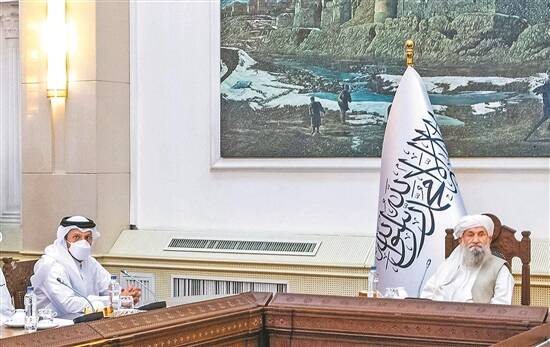 12日,哈桑·阿洪德(右)在首都喀布尔会见到访的卡塔尔副首相兼外交大臣阿勒萨尼 图/人民视觉