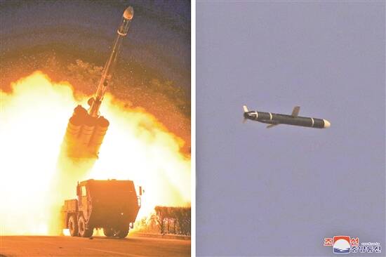 新华社电 据朝中社13日报道,朝鲜国防科学院11日和12日分别成功试射了新研发的远程巡航导弹(见上图)。