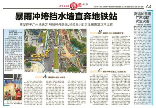 今年7月30日12时46分许,因突降暴雨,位于广州市黄埔区科学大道的广州地铁二十一号线神舟路站在建IV号出入口地平面挡水墙被积水冲垮倒塌,地表积水下泄到基坑后通过过道涌入车站,造成地铁二十一号线黄村站至苏元站共6个站暂停营运7小时。