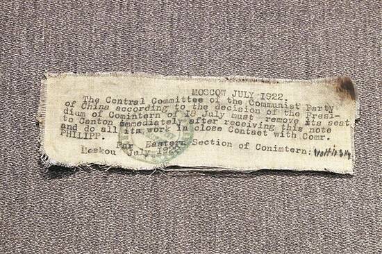 这一建议被采纳。1922年7月18日,《共产国际给中国共产党中央委员会的命令》决定中共中央驻地由上海迁往广州。马林将这份指令用英文打印在一块白色绸缎上,缝进自己的衬衣里,秘密携带来华。