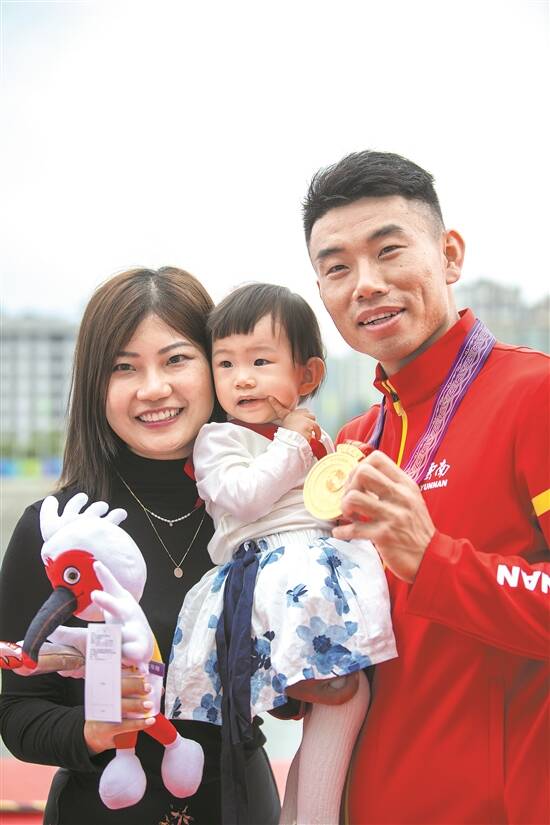 郑鹏飞与妻子女儿庆祝夺冠 羊城晚报特派陕西记者 梁喻 摄