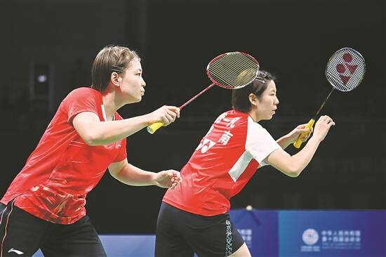 广东运动员陈清晨(左)与搭档贾一凡的拍子有故事 羊城晚报特派陕西记者 梁喻 摄