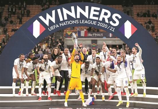 羊城晚报今晨消息 记者刘毅报道:第二届欧洲国家联赛今晨在米兰的圣西罗球场上演决赛,法国以2比1逆转西班牙首次捧杯(下图,新华社发);季军争夺战,东道主意大利以2比1击败比利时。