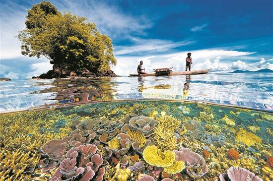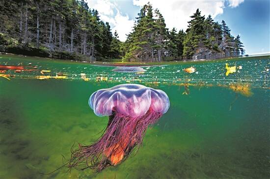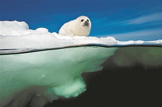 每张照片在视觉上都被分割成上下两半,形成“两个世界”,但似乎又浑然一体,共依共存。比如在珊瑚密布的巴布亚新几内亚金贝湾,我们可以看到水面上撑船而过的人类与水面下大片的珊瑚和平共存;在南极洲丹科岛,我们看到海面上的小海豹与海面下的冰山相映照;在加拿大纽芬兰格罗斯莫恩国家公园博恩湾峡湾,我们可以看到水下巨大的水母与水面上宁静的森林互相欣赏……