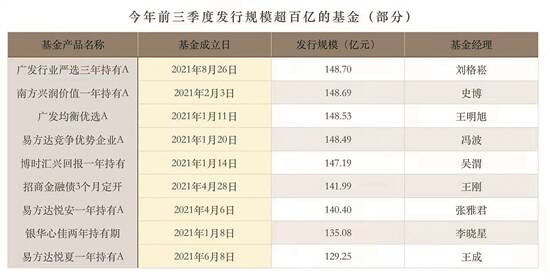 对此,有市场分析人士指出,明星基金经理云集,这是头部公募吸金的重要“法宝”。今年来不少百亿元基金产品背后管理人正是备受关注的“顶流”基金经理。以近日刘格菘发行的广发行业严选三年持有期混合基金为例,原本预计5天认购时间,但实际上2天就已完成认购,募集金额远超150亿元。