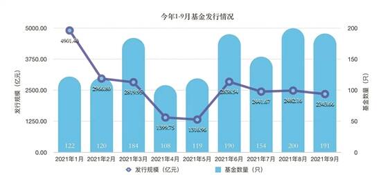 今年一季度基金发行火爆,多只百亿爆款基金在此期间诞生,发行规模超万亿元。但随着核心资产的急剧回调,基金发行骤然降温,二季度发行规模缩减至5555.25亿元。进入三季度,基金发行又有所回暖,三季度合计发行规模超7200亿元。