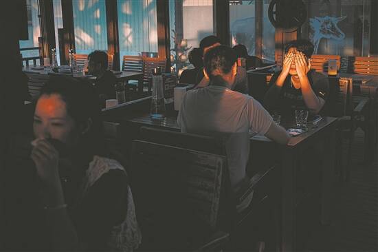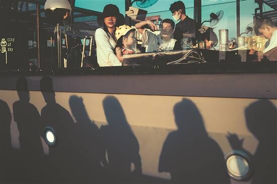 步入餐厅内,等待用餐的顾客早已就座。由于还没到真正的饭点,厨房还未能及时供应上碟。三杯饮品下肚,阻挡不了饥肠辘辘的叫声,心烦意躁在所难免。记者感觉这是最容易捕捉人的异样神态的时刻,恰逢一缕阳光斜照,分梯次地指向前后三重人的头部。戏剧感来了,如同加了色纸的聚光灯,让本不相干的两桌人物有了联系。这不是扫街摄影应有的样子吗?摄影师就是导演,只要观察足够细腻,哪里都能变成舞台。