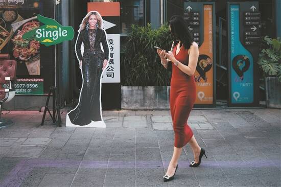 紧身红裙女郎经过酒吧前,与一广告牌上的外国女星衣着“同款”,趣味点自然而来。这是世界著名的人文摄影家布列松的惯用手法:“寻找相似之处”,后来成为街头摄影师喜欢的构图方式,除了画面会产生有趣的主题对比之外,摄影师也可以透过这种方式将画面中的故事性加强。图中的“真人”低头刷手机,长发挡脸,外表光鲜却略显凝重。与“假人”正脸欢笑形成反差,这种神秘的冲突关系能引导读者展开想象。